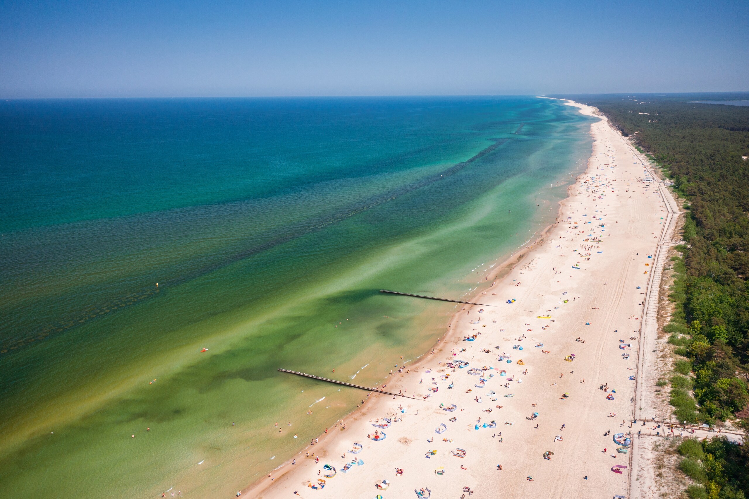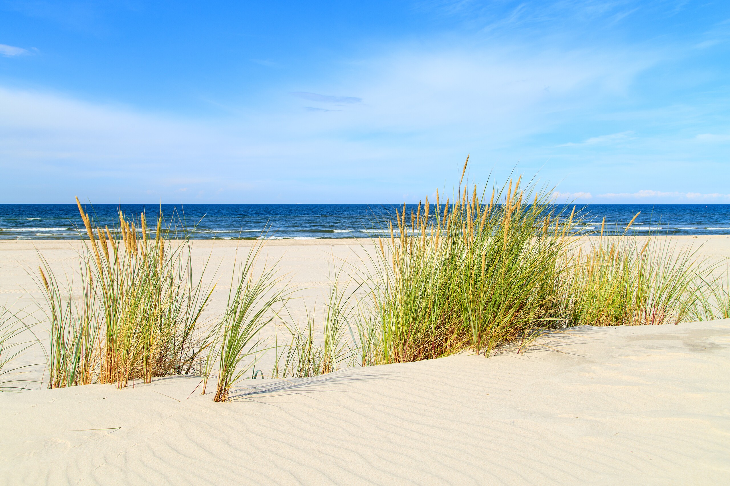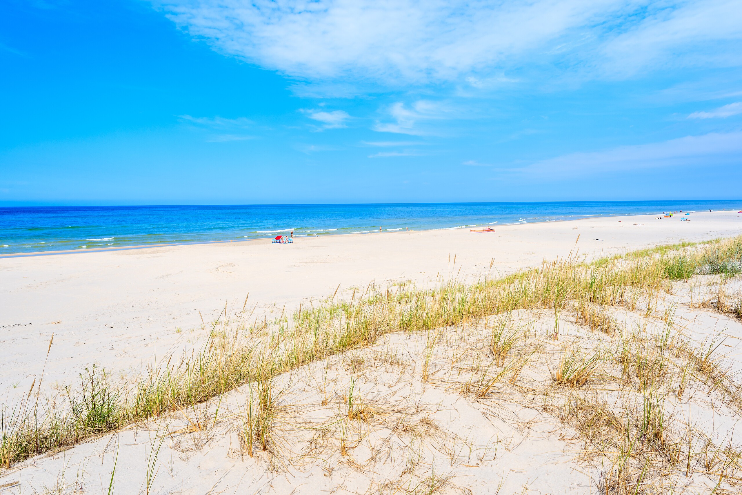 Łeba is famous for its very wide, sandy beaches with light, powdery sand. The shore is divided by the mouth of the Łeba River: the western part offers close proximity to infrastructure (promenade, port, restaurants, playgrounds) and guarded swimming areas, making it a popular choice for families. The eastern side offers longer, more intimate stretches – the further from the beach entrances, the quieter and more peaceful, perfect for relaxation, walks at the golden hour, and photos with the dunes in the background. The city has introduced clear entrance numbers – 01 – which makes it easier to arrange and navigate the beach. During the season, there are several bathing zones "A/B/C" with lifeguards and ongoing monitoring of water quality.